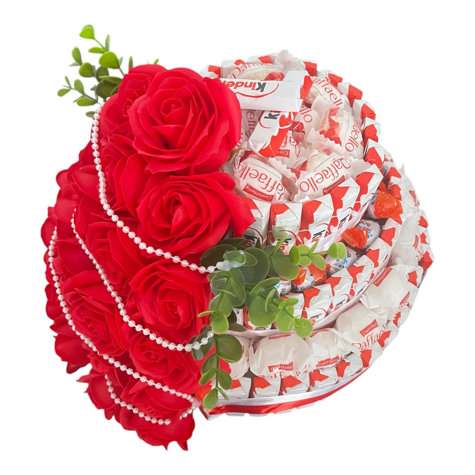 Unsere 3-stöckige Torte ist ein wahrer Hingucker! Die Torte ist außen mit Kinderschokoriegeln bestückt, die für einen perfekten Schokoladen-Genuss sorgen. Die Riegel sind sorgfältig um die Torte angeordnet, um einen einheitlichen und ansprechenden Look zu schaffen.
