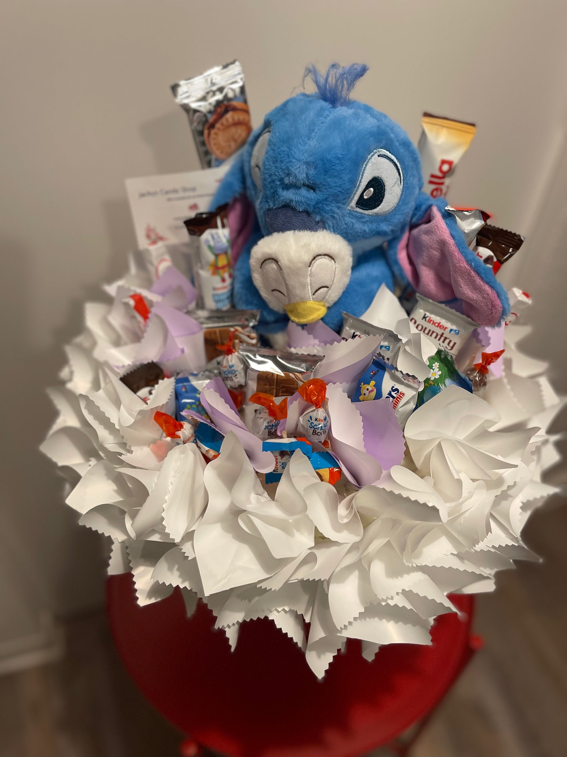 Unser Disney-Traumstrauß ist ein besonderes Geschenk für Kinder, das sie sicherlich zum Strahlen bringt! In der Mitte des Straußes umarmt Stitch den beliebten Donald Duck, umgeben von einer Auswahl an leckeren Kinder-Schokoladenprodukten.