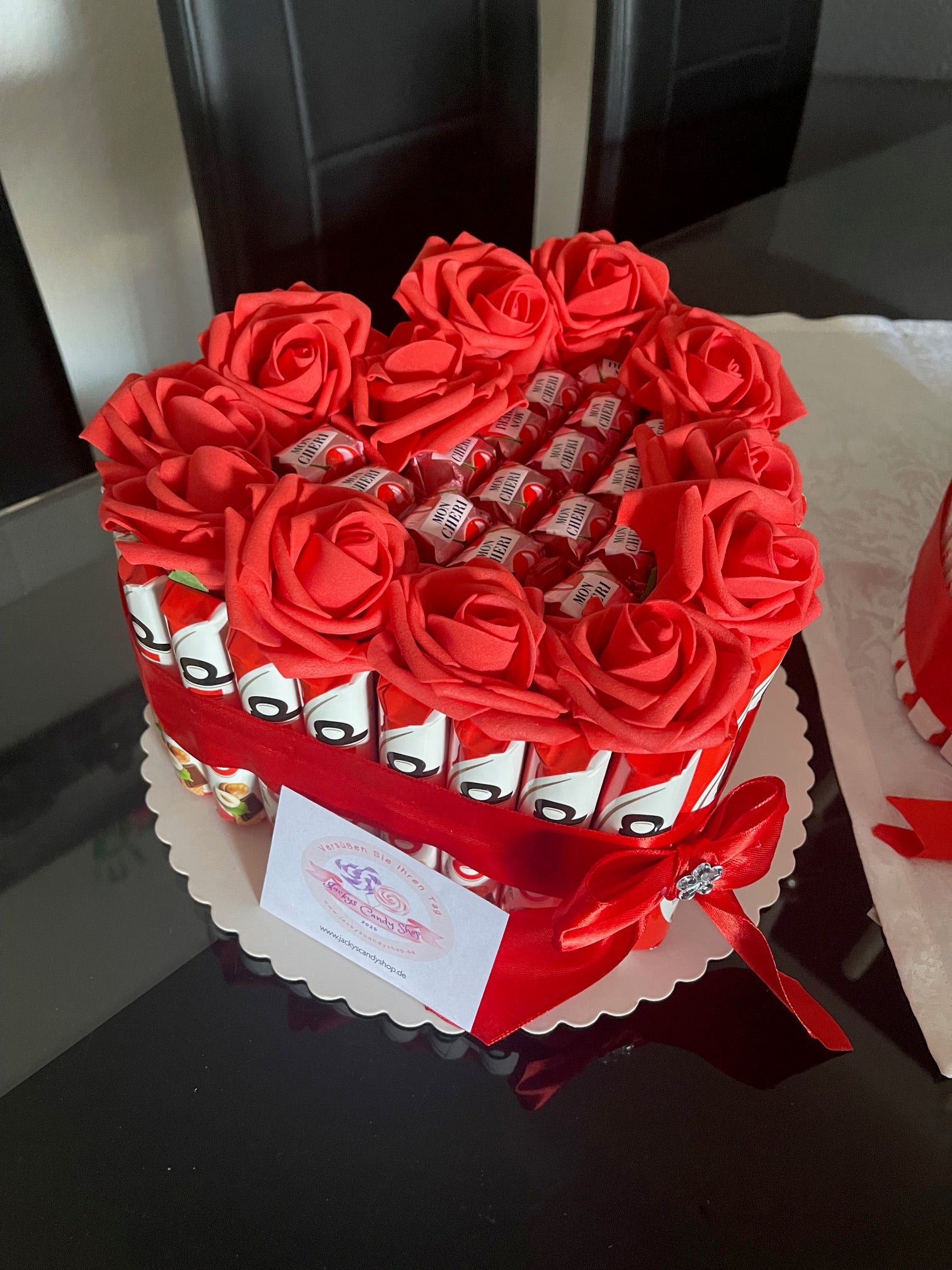 Entdecken Sie unser handgefertigtes Duplo Herz, das mit köstlichen Mon Chéri Pralinen gefüllt ist! Jedes Herz wird mit viel Liebe und Sorgfalt hergestellt und vereint die zarte Schokoladenhülle von Duplo mit der verführerischen Kombination aus Nougat und dem fruchtigen Kirschlikör von Mon Chéri.
