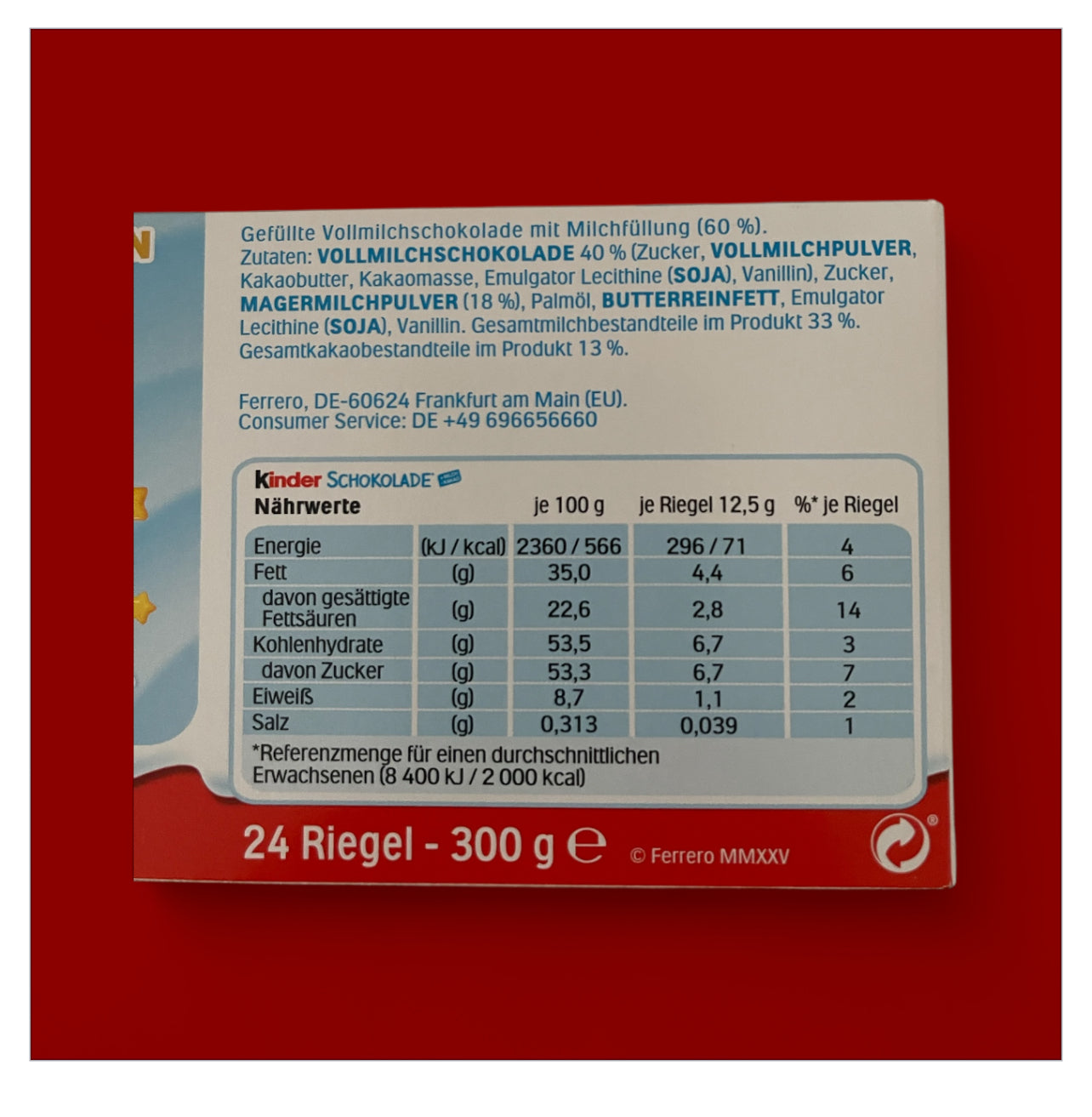 Dieser einzigartige Stern ist 25 cm groß und besteht aus einen Styroporstern 7 cm hoch und aus Kinderschokolade, außen mit 40 Kinderriegel-Schokolade.